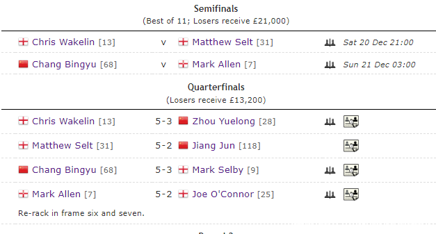经由强烈争夺,常冰玉、周跃龙、江俊三名选手晋级8强,其中,常冰玉以4-1淘汰“囧哥”凯伦-威尔逊,周跃龙以4-3险胜2015年世锦赛冠军“大鲨鱼”斯图亚特-宾汉姆。